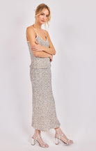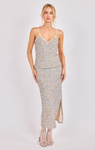 Silver sequin Maxi skirt.  Pair with the Luster camisole top for a night on the town!