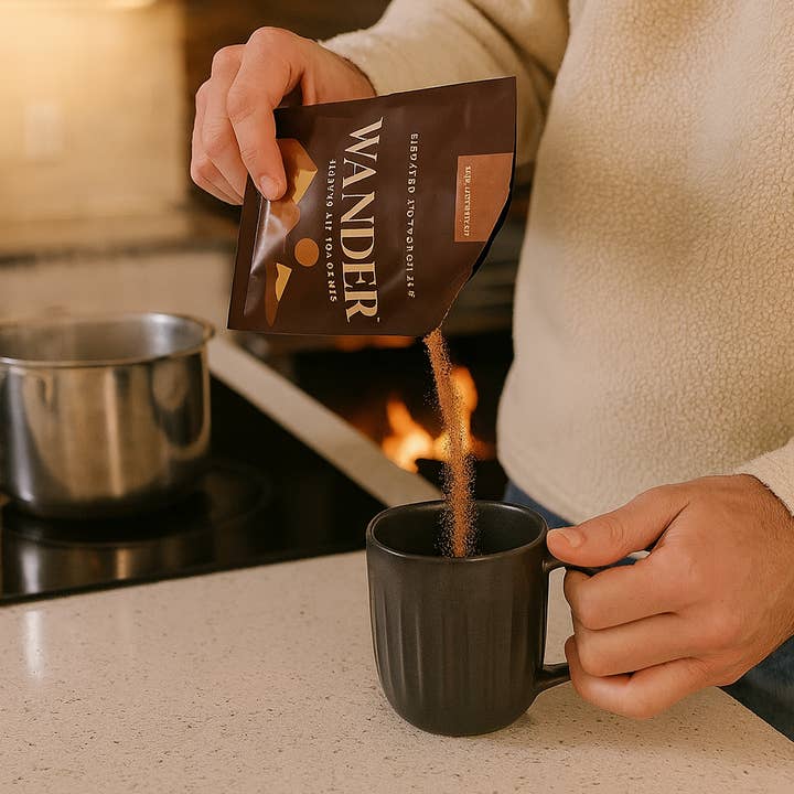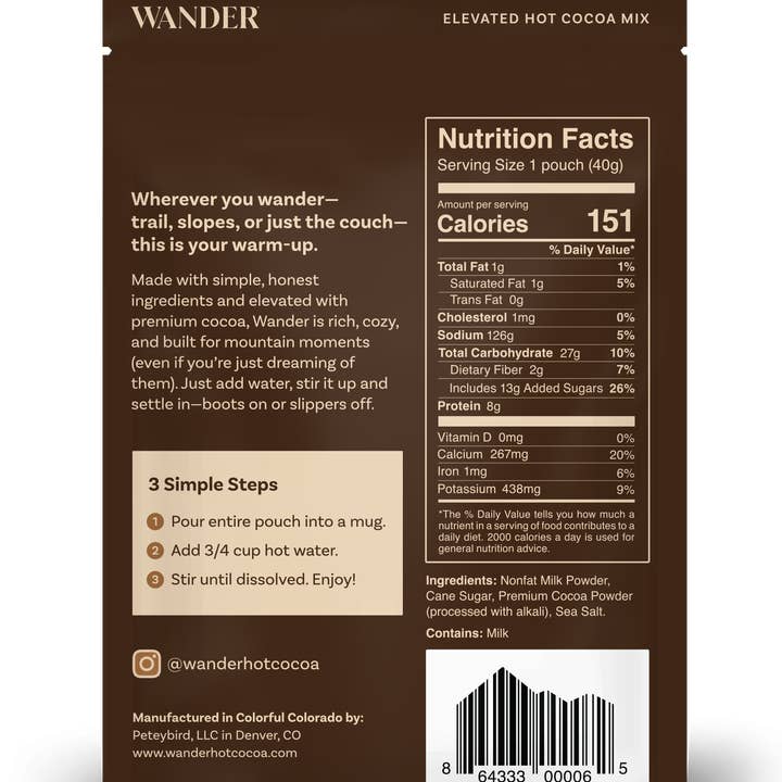 Born in the Rockies, Wander Hot Cocoa is made for mountain moments. Our mix is crafted with simple, high-quality ingredients, creating a creamy, rich cup of cocoa by just adding hot water—no milk required!