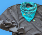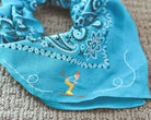 Turquoise embroidered with mini skier skiing along edge. Perfect for the ski season lover.