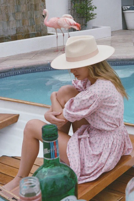 • Grosgrain edged hat rim and bow ribbon detail.