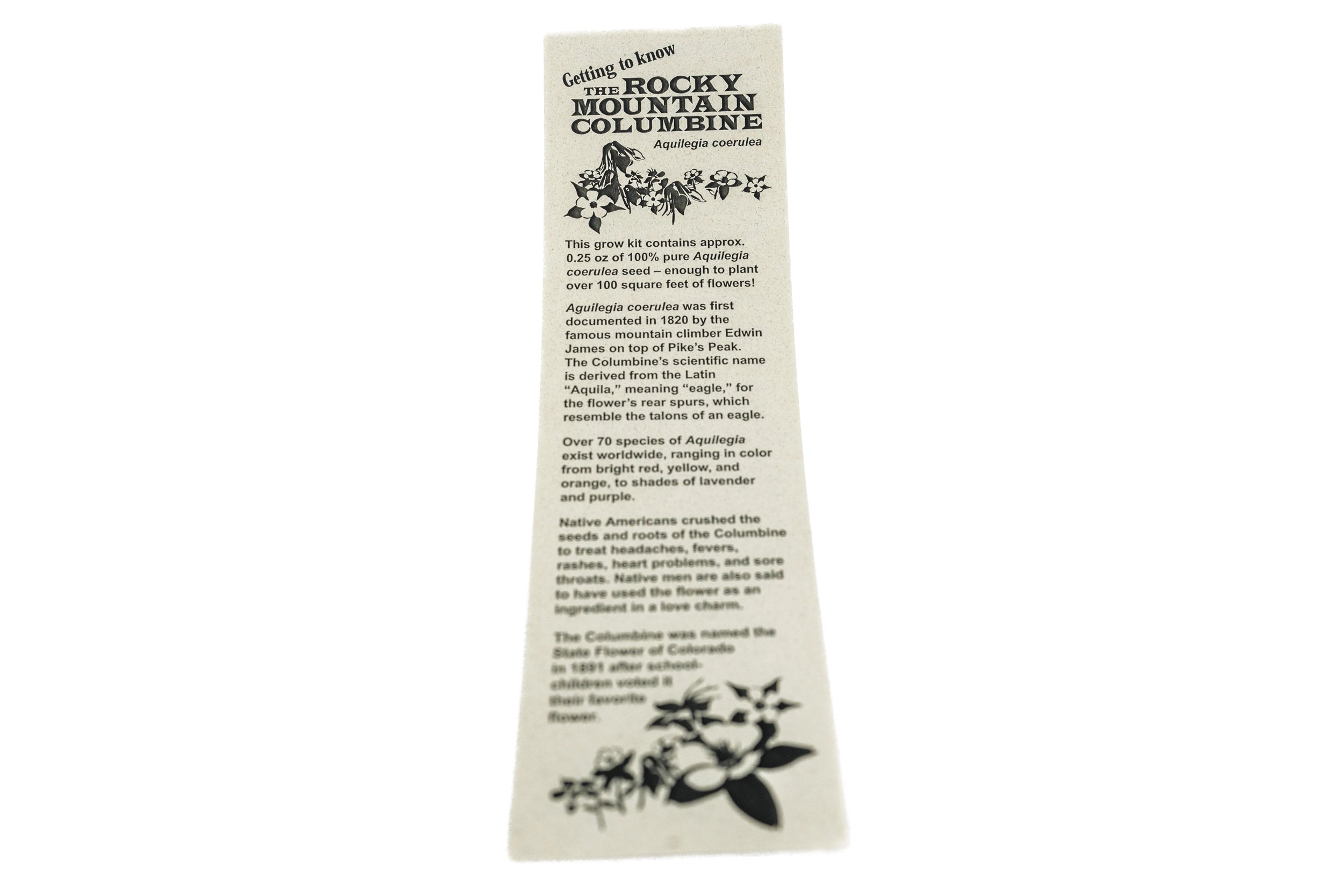Aguilegia coerulea was first documented in 1820 by the famous mountain climber Edwin James on top of Pike’s Peak. The Columbine’s scientific name is derived from the Latin “Aquila,” meaning “eagle,” for the flower’s rear spurs, which resemble the talons of an eagle. Over 70 species of Aquilegia exist worldwide, ranging in color from bright red, yellow, and orange, to shades of lavender and purple. Native Americans crushed the seeds and roots of the Columbine to treat headaches, fevers, rashes, heart problems, and sore throats. Native men are also said to have used the flower as an ingredient in a love charm. The Columbine was named the State Flower of Colorado in 1891 after schoolchildren voted it their favorite flower. This grow kit contains approx. 0.25 oz of 100% pure Aquilegia coerulea seed — enough to plant over 100 square feet of flowers!