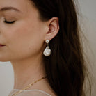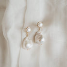 Natural freshwater Baroque pearls hang from gold plated bezels set with 8mm freshwater pearls and sterling silver stud posts.