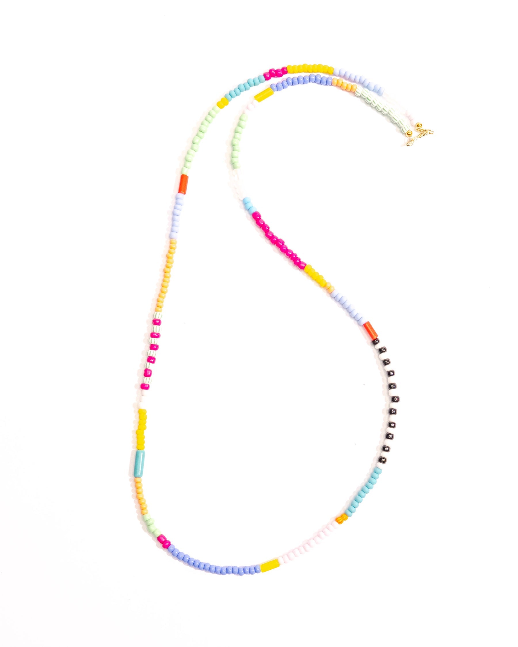 A mix of African seed beads measures approximately 30" long. Can be worn long or double wrapped.