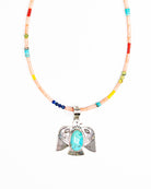 Sterling silver and turquoise thunderbird mixed with coral African glass and spacers. 18.5” long. Turquoise thunderbird is removable and necklace can be worn solo.