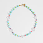 Five white jade stars mixed with light blue turquoise, pink bamboo coral, and seed beads. Measures approximately 16.5 inches long.