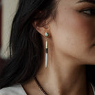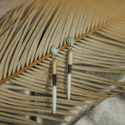 Natural, mostly white porcupine quills set in .22 bullet casings, hanging from natural 8mm turquoise stones set in brass bezels with sterling silver stud posts.