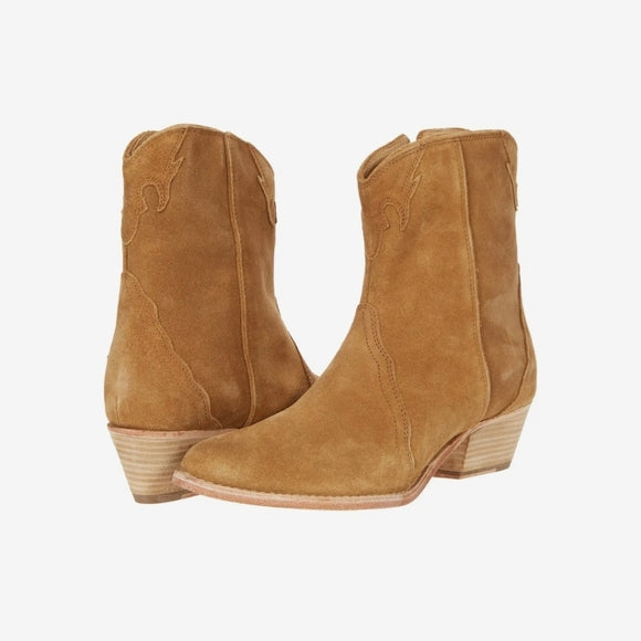 .Stand out in these suede ankle boots in a western-inspired silhouette featuring a stacked heel and almond toe.