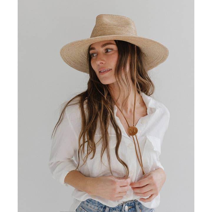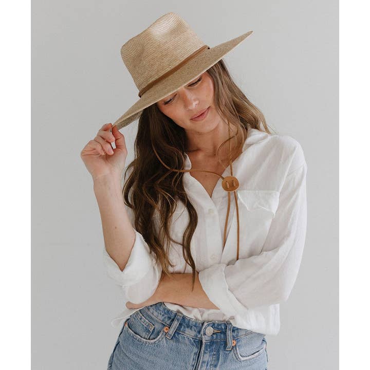 The exceptional straw for whatever the day might bring. The river is a sturdy, natural colored straw hat shaped into a teardrop fedora crown + wide, flat brim that offers amazing sun protection. Trimmed with a brown, genuine leather chinstrap with a leather slider, the river stays put on beach days + drips elegance when you dress it up for brunch.