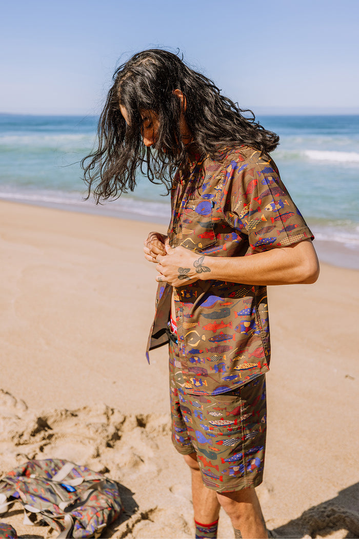Casual fit, short sleeve button up shirt, button down collar with interior KAVU logo jacquard tape, contrast interior neck band and under placket piecing, single chest pocket with button closure, faux wood buttons, back yoke panel, curved hem.