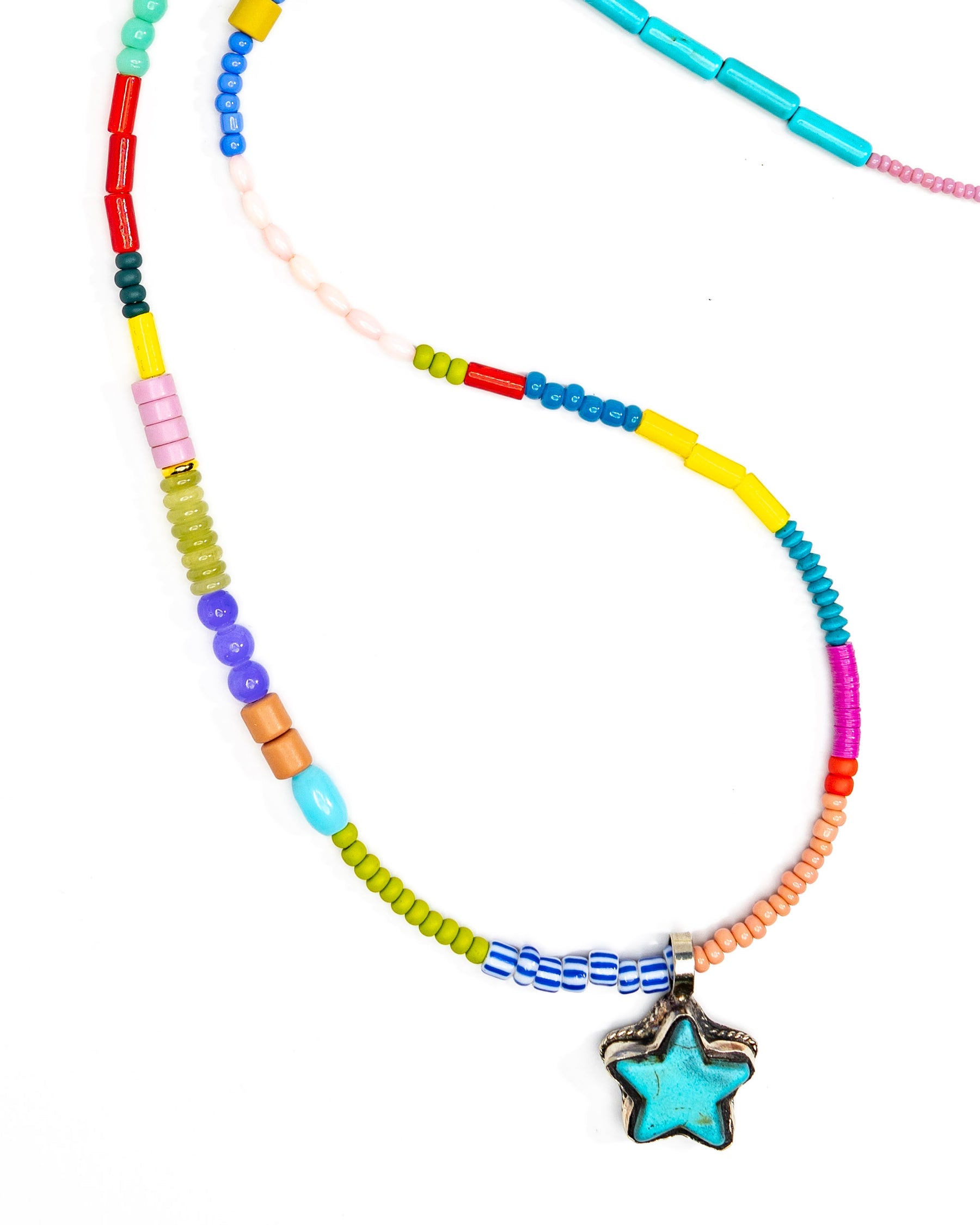 Mix of colorful beads and removable star pendant. Measures 33.5” long to wear long or double wrapped.