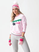 Whether you’re layering up to hit the slopes or getting ready to pop a bottle, you will appreciate the snug and soft Champagne Ski Club Sweatshirt. It is made from a lightweight cotton blend with green and pink stripe details at the hem and matching green, blue, and pink embroidered lettering. Its classic round neck and banded hems make it the perfect casual fit and your ultimate lounge piece.