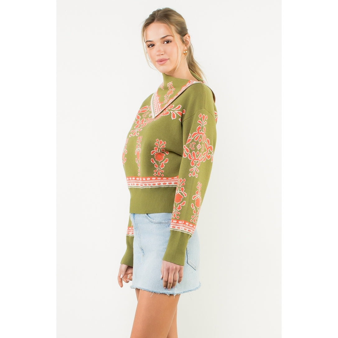 Pattern Sweater with scarf neckline. Royal Blue & Orange