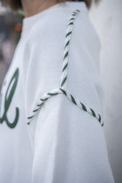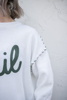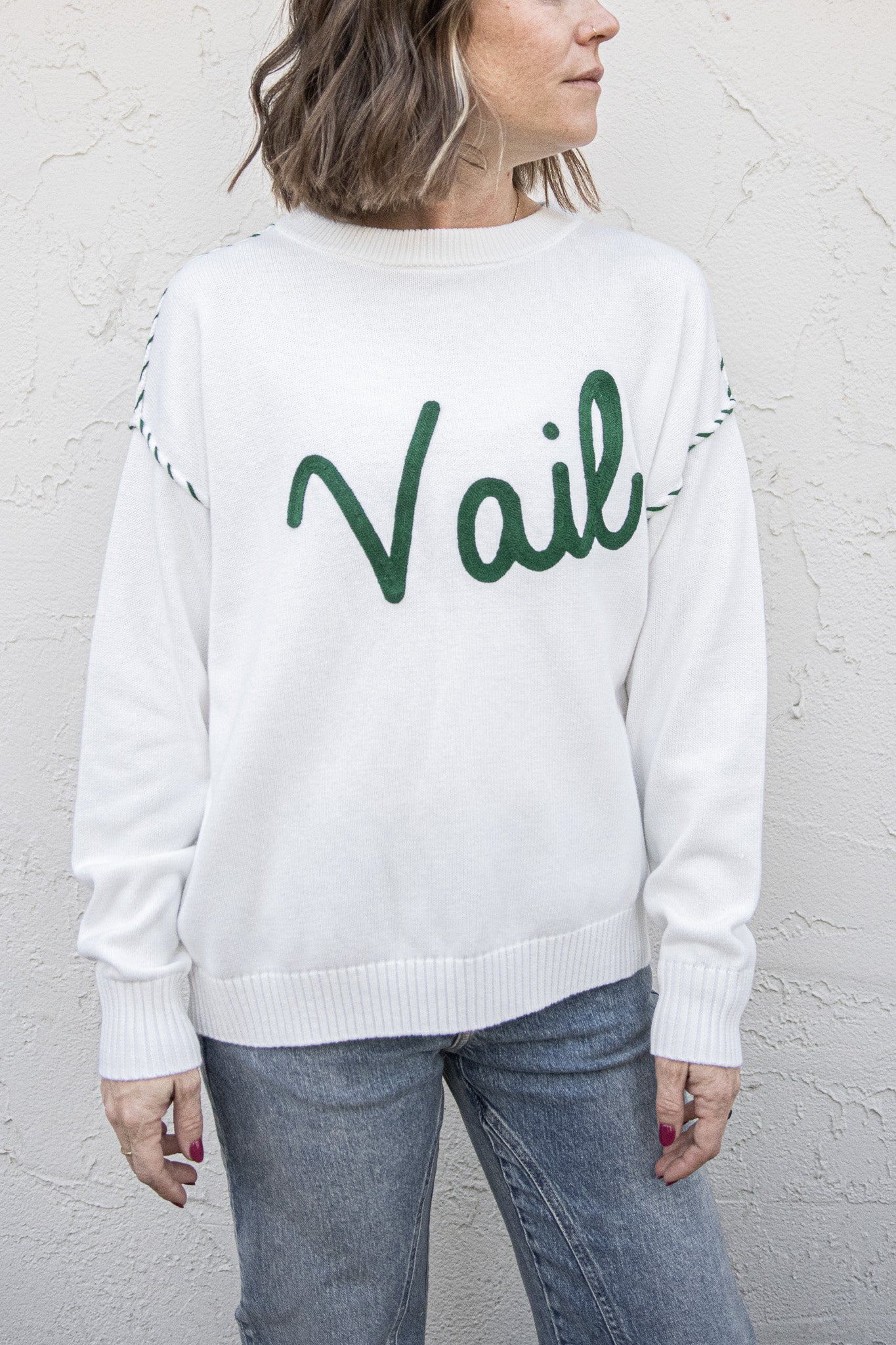 Crew neck sweater in Ivory with Green script Vail logo across chest.  Whip stitch accents on shoulders and sleeves