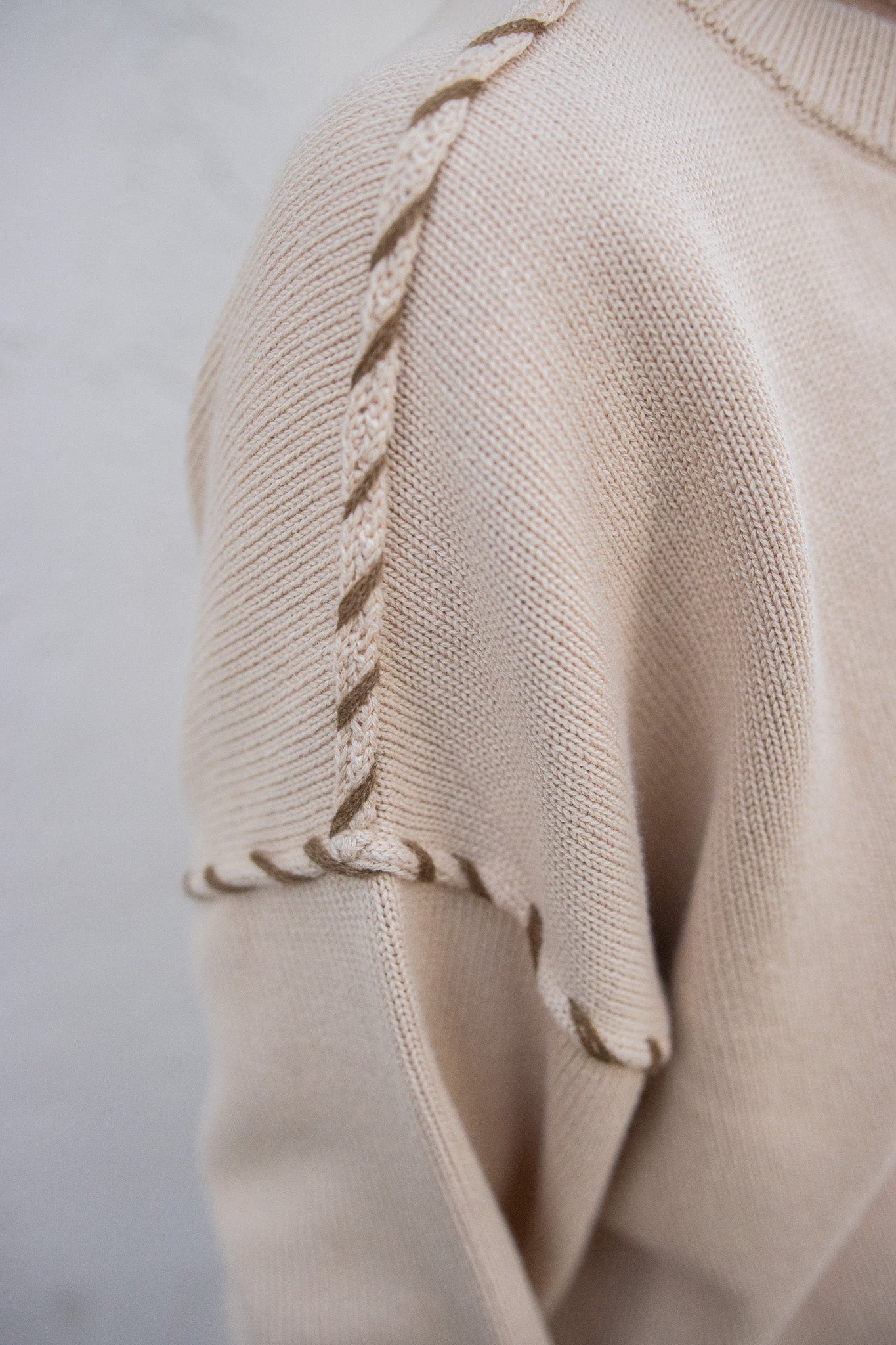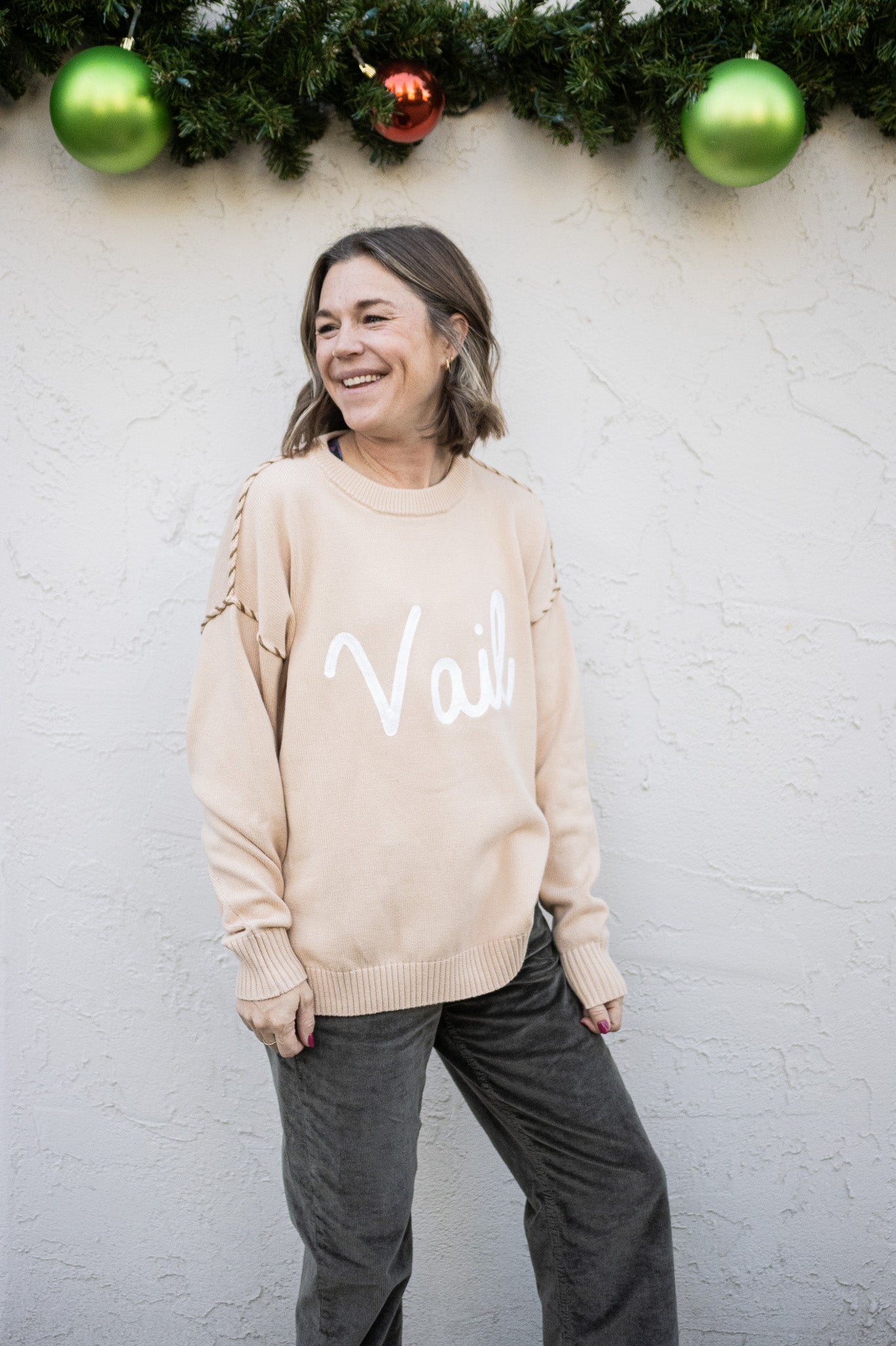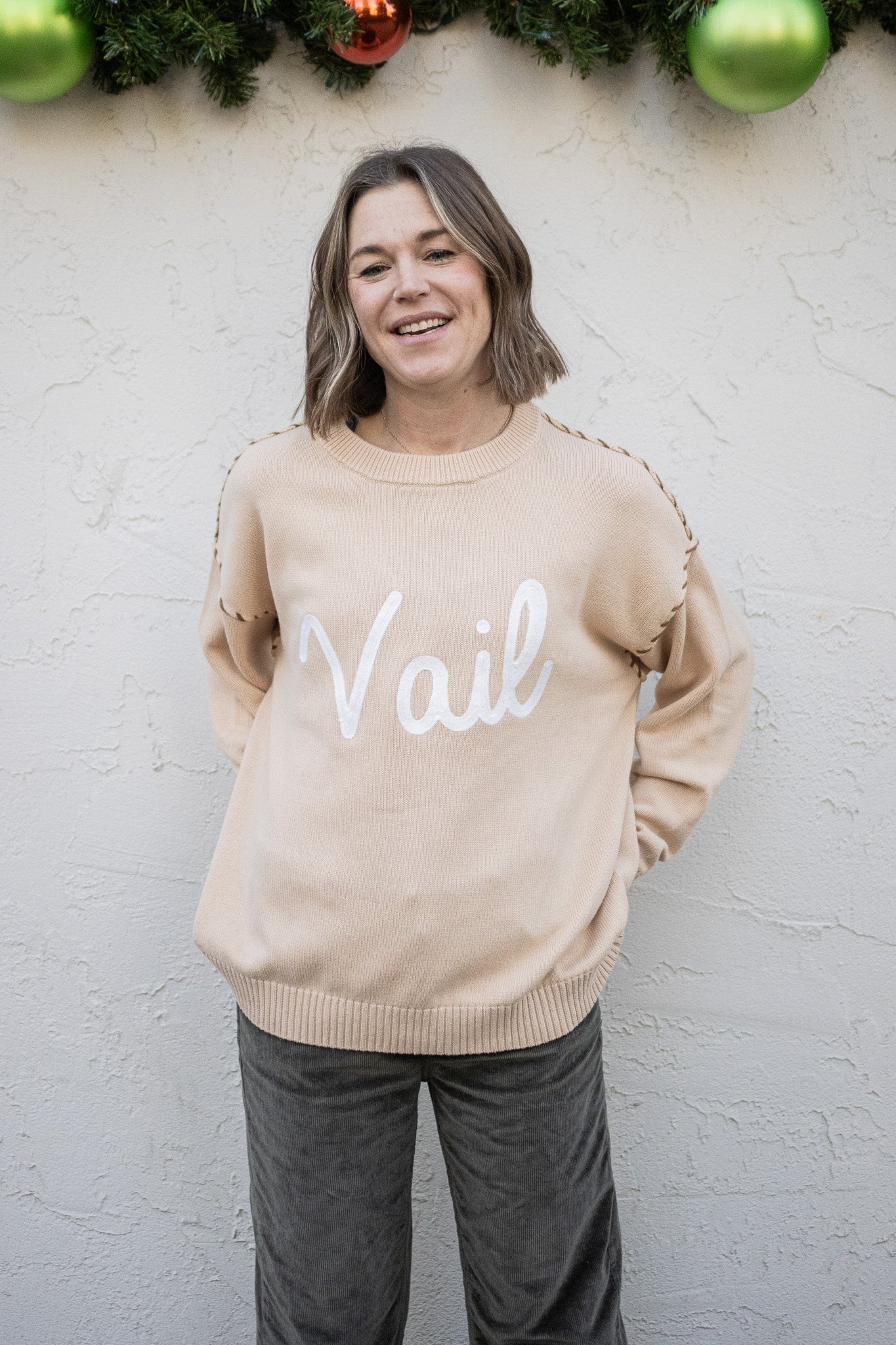 Crew neck sweater in beige with Ivory Script Vail logo across chest. Whip stitch accents on shoulders and sleeves