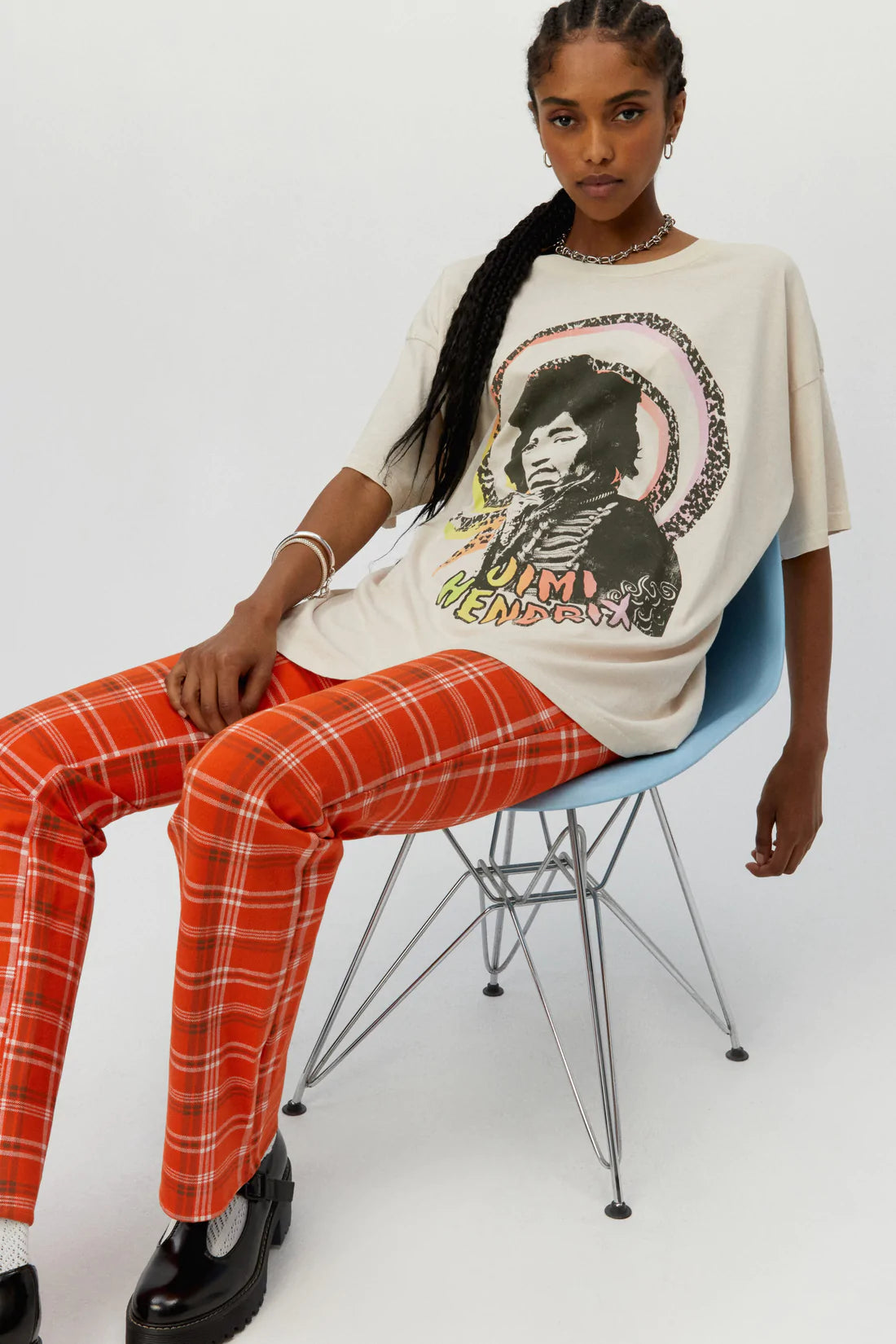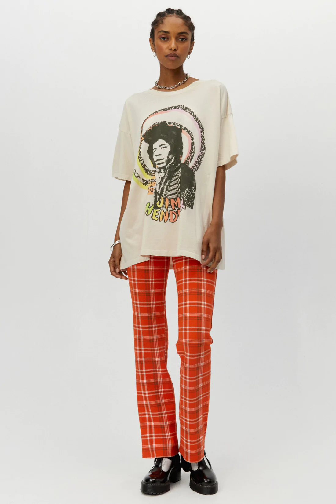 The pioneer of electric guitar possibilities and one of the most celebrated musicians of his time, Jimi Hendrix lands on our roster. Mixing fuzz, feedback and controlled distortion, Hendrix ignited a whole new musical form. A portrait of the jack of all trades hits center on this relaxed merch tee highlighted in a multi-colored spiral with the icon’s name in hand-drawn letters. A creative rendition for one of the most creative himself.