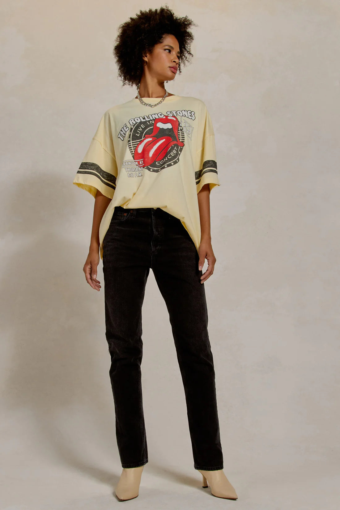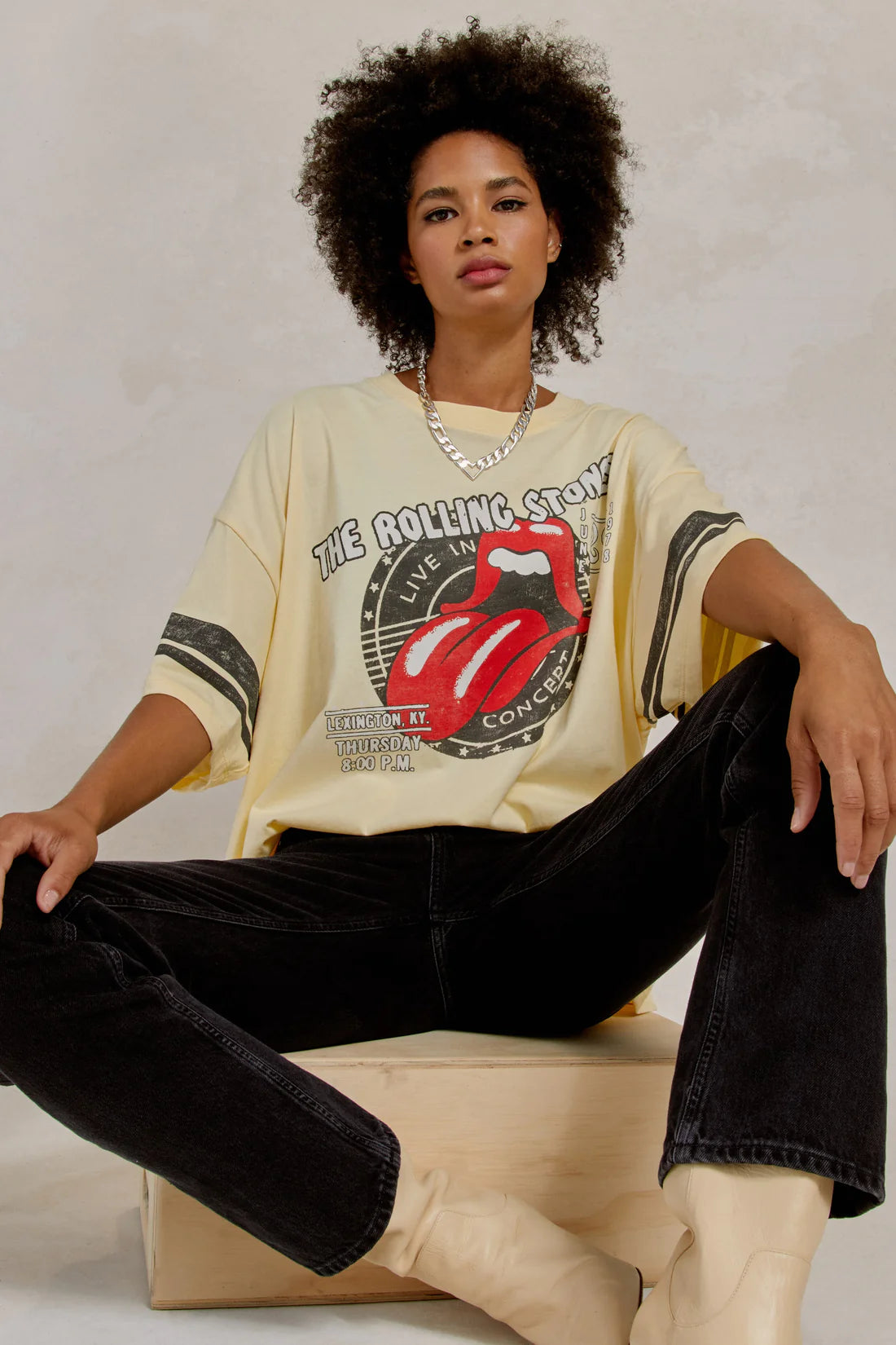 Make some noise for an explosive Rolling Stones release. Following the drop of their ever-popular album, “Some Girls,” the Stones set out on a 24-city tour. Marking their 11th stop at Lexington’s Rupp Arena on June 29, 1978 is this fan favorite one size tee featuring a stamp of the group’s hot lips logo and show details center chest. With no shortage of authenticity around here, it’s almost like you took this off the back of a concert goer. Accented with varsity striped sleeves.