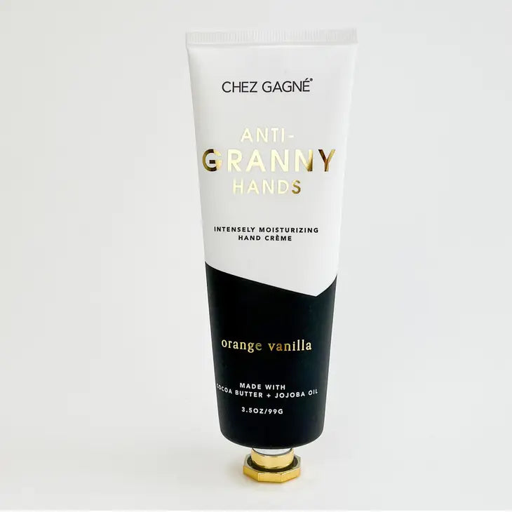 • Anti-Granny Hands Moisturizing Hand Cream with Cocoa Butter and Jojoba Oil Scent: Orange Vanilla Recyclable Tube with Gold Cap 3.5 oz / 2.4 x 5.75 Tube Size Made in the USA from Domestic and globally sourced components Vegan and Cruelty-Free