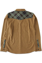Casual fit, long sleeve button up shirt, stand collar, two chest pockets with flap and button closure, western style plaid bias cut front and back yoke with side pleats, plaid lined collar band, adjustable cuffs and logo snap on sleeve placket, 25% certified recycled polyester faux horn buttons, curved hem