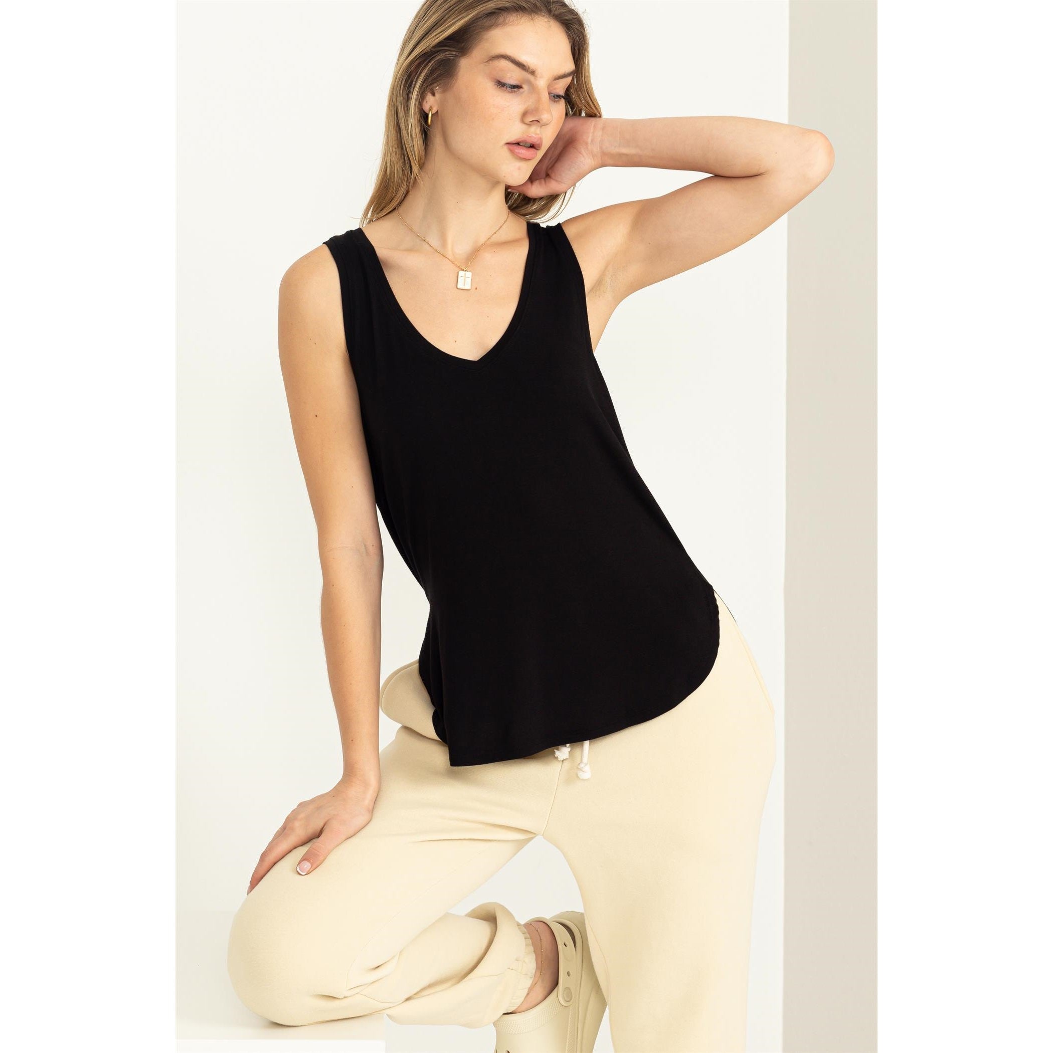 The Call Me Yours V-Neck Tank Top loves to be styled simply! It showcases a relaxed silhouette, a V-Neckline, and a sleeveless bodice with tank straps. Pair with high-waisted shorts and sneakers for a perfect casual day 'fit!