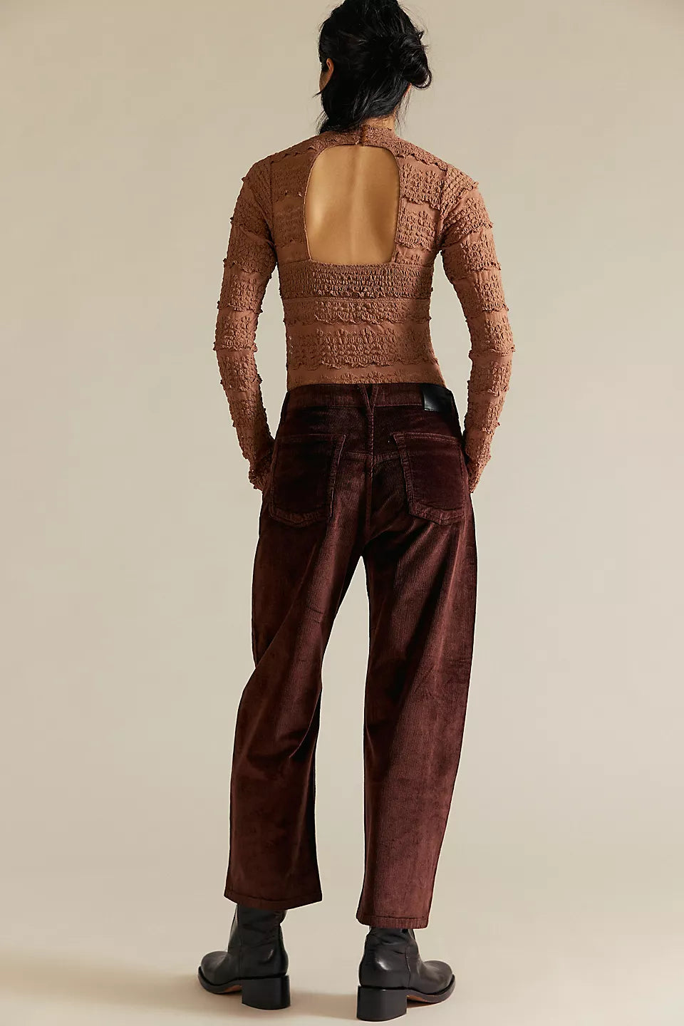Low-rise, dropped barrel fit, Soft, stretch corduroy, Button-fly closure, five-pocket design, ankle-length inseam.
