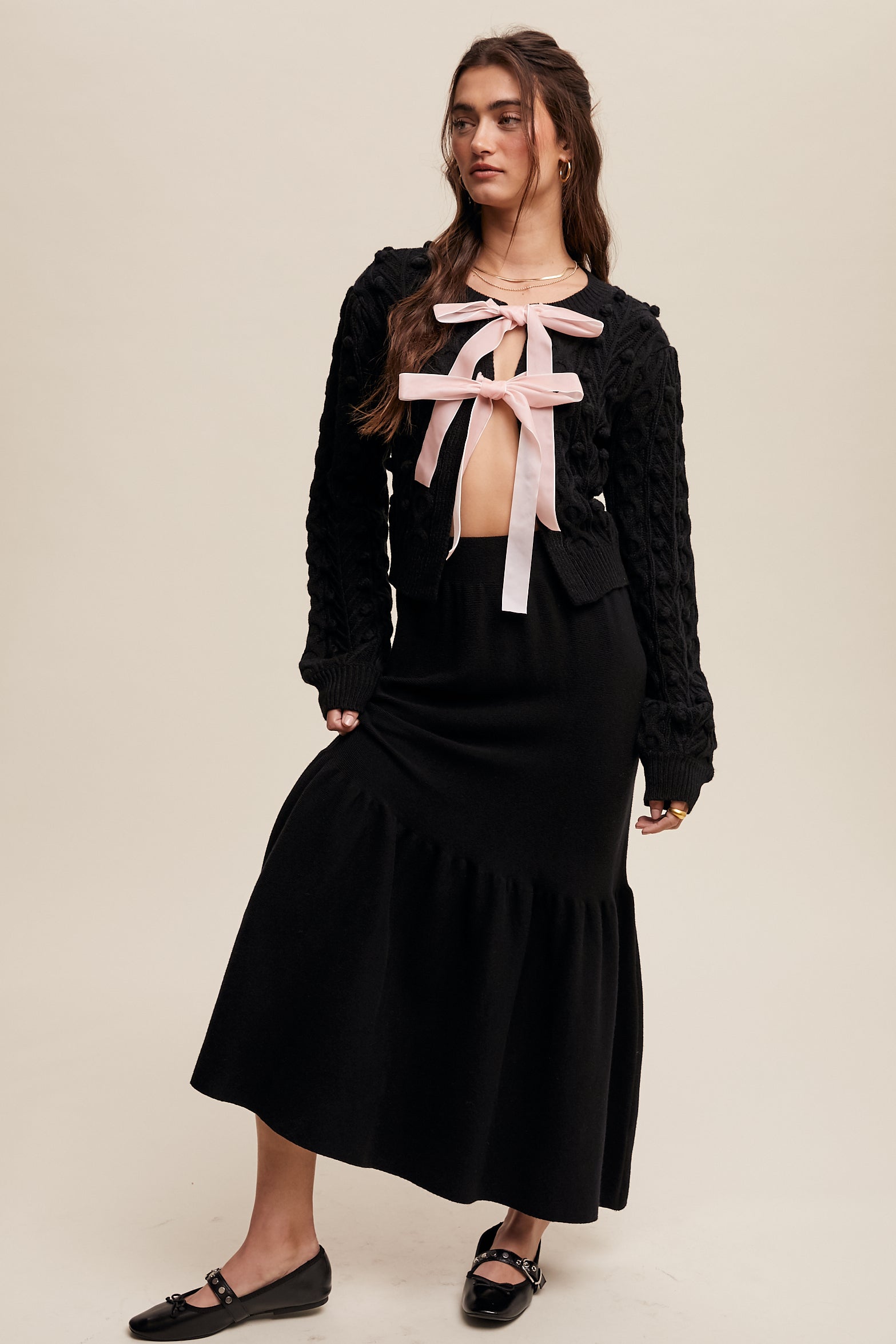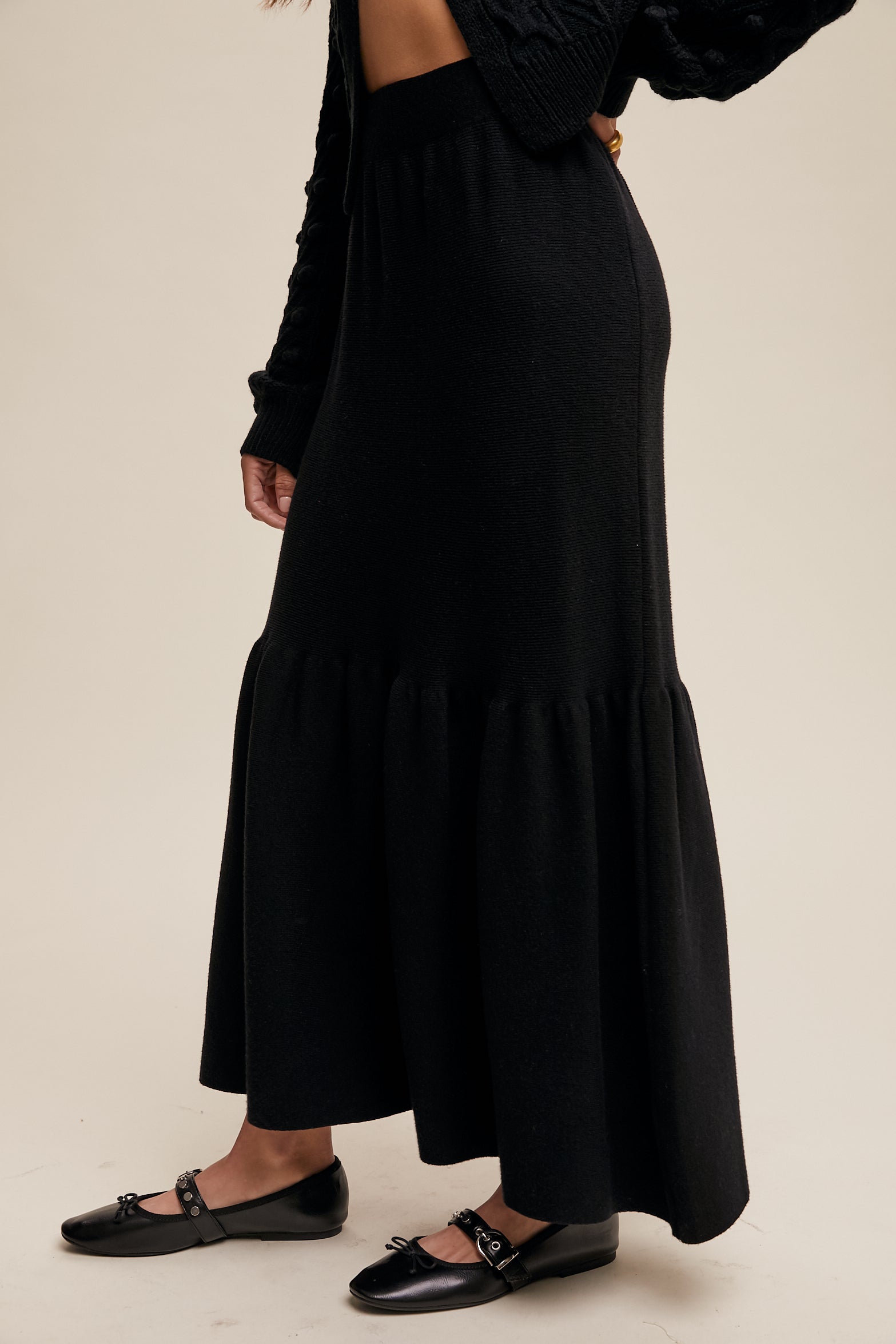 High waist flounce hem knit maxi skirt, Elastic on waist, Flounce hem