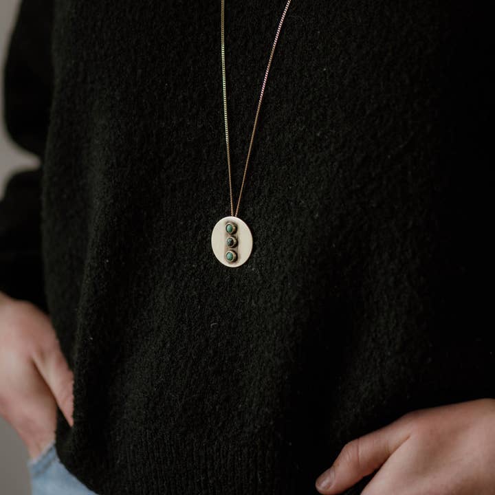 A statement piece that is ethically sourced and designed with nature in mind. This pendant charm necklace boasts a solid antiqued brass setting, adorned with 4mm turquoise stones that lend a pop of blue.