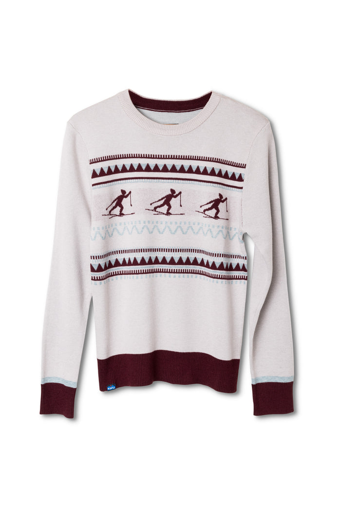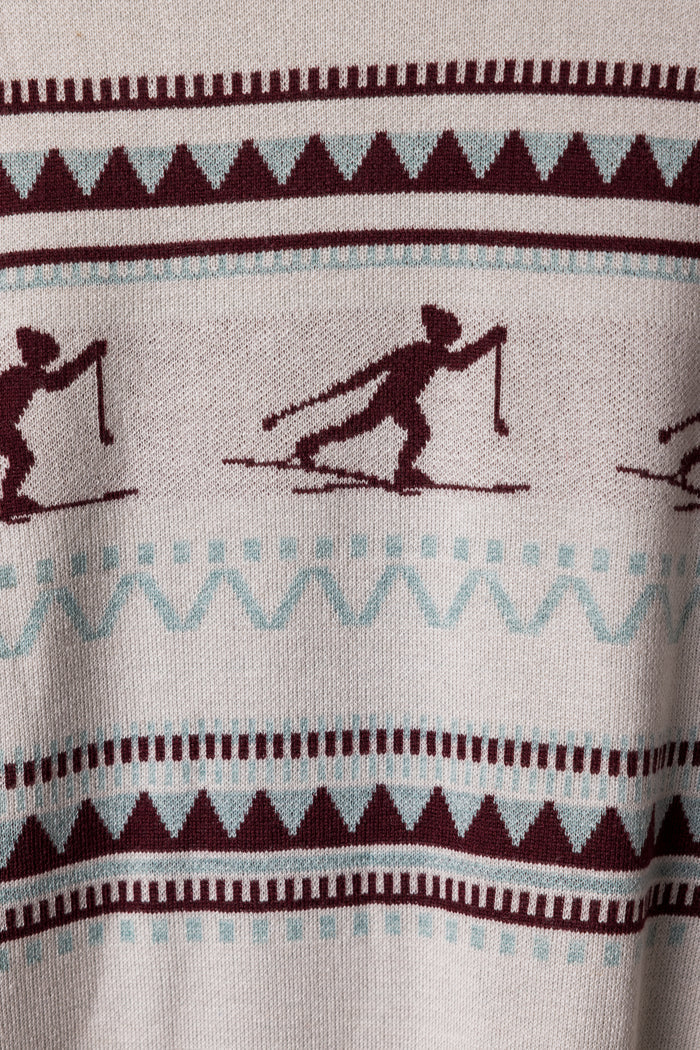 Coolest sweater EVER. Semi-fitted, birdseye jacquard fully fashioned crew neck sweater, ribbed collar, cuffs, and hem, hip length.