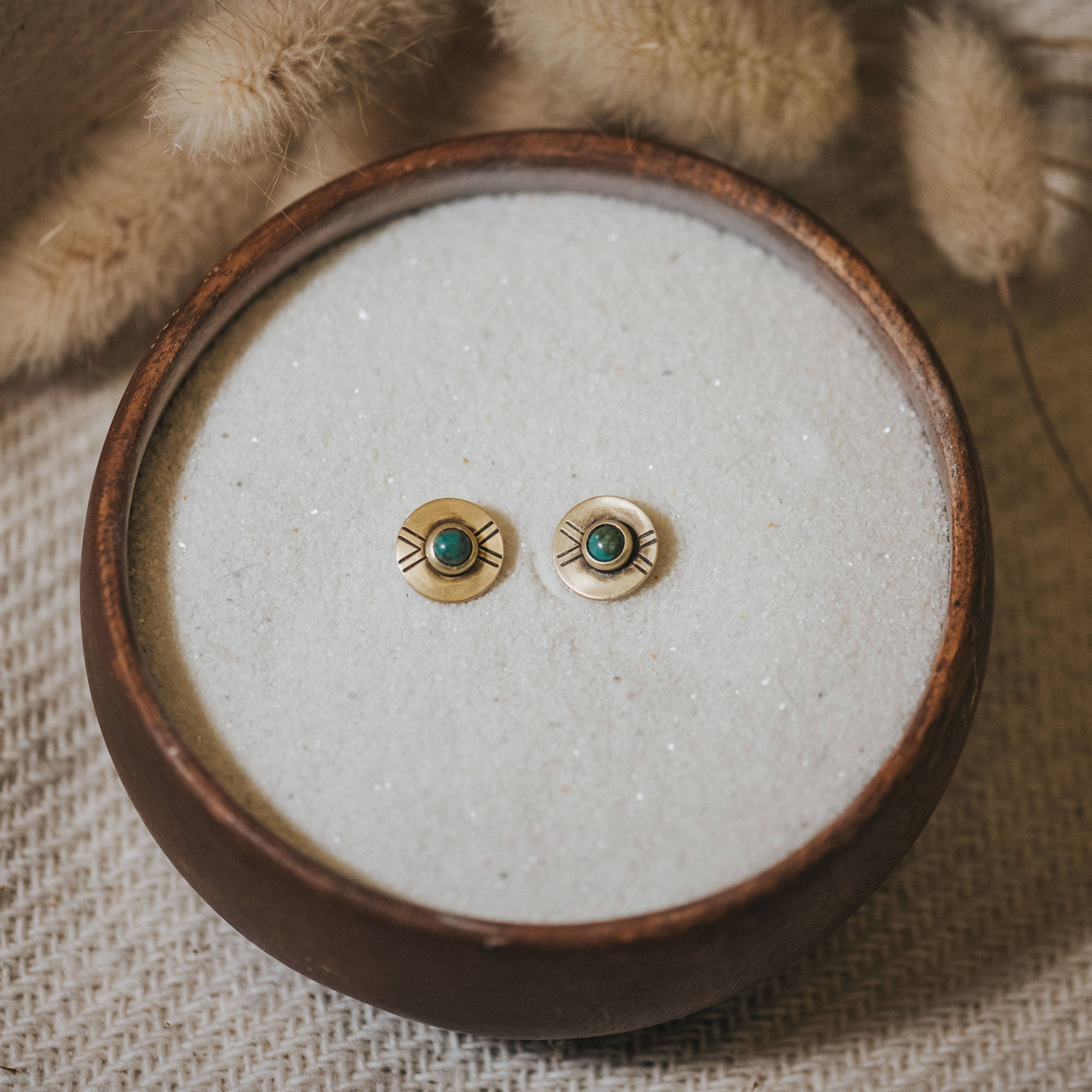 4mm turquoise stones on small antiqued, brushed brass discs with sterling silver studs.