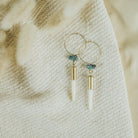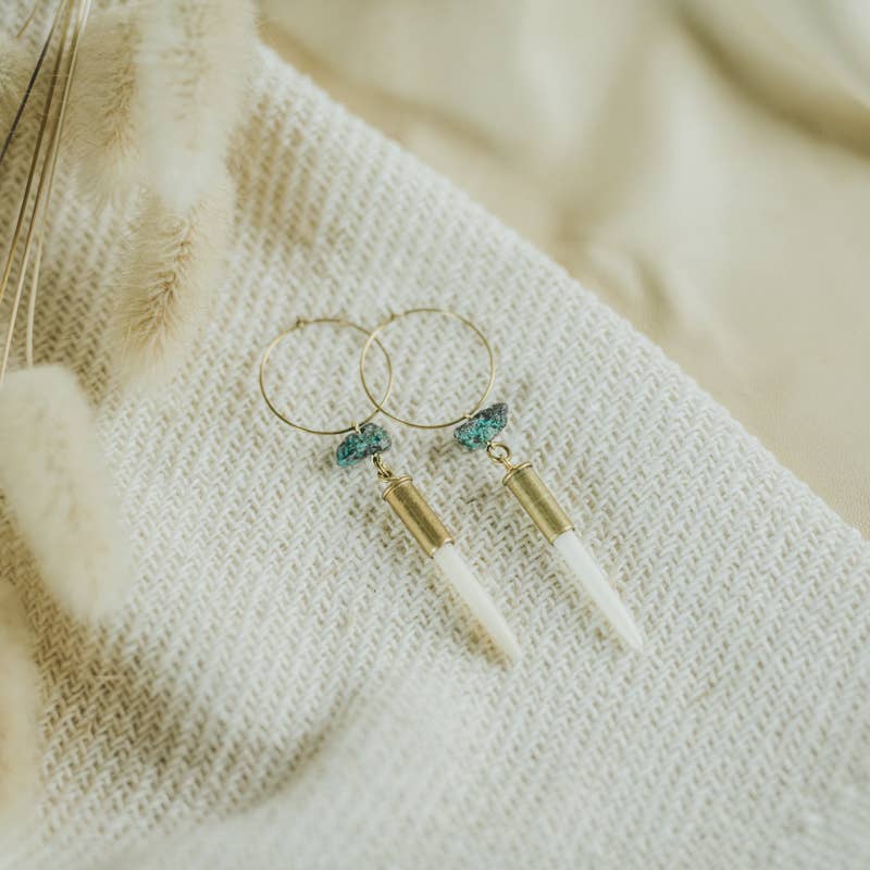 Natural porcupine quills set in .22 bullet casing with American Turquoise on 1" brass hoops.