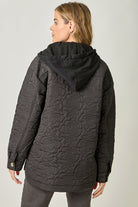Twofer Hoodie Quilted Jacket Attached hoodie layer with drawstring Front zipper closure and button down Chest and side pockets Floral pattern throughout Side slits