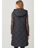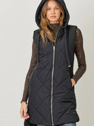 Quilted Puffer Long Hoodie Vest Front zipper closure Thigh length Side pockets Hoodie with drawstring Hi-lo hem with side slits