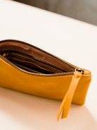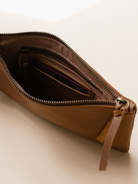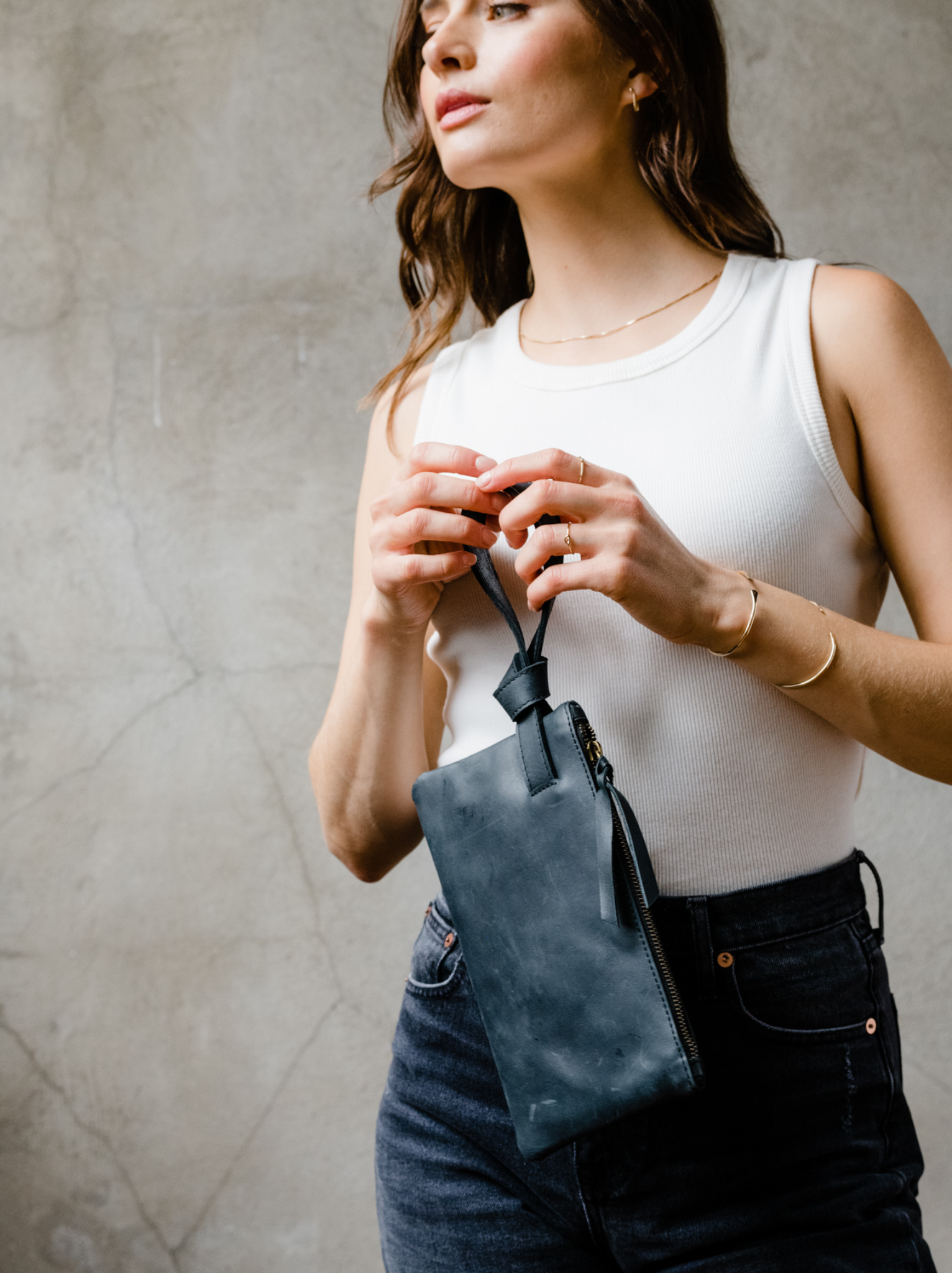 The perfect on-the-go pouch. 100% genuine leather exterior with lined cotton interior -Features lined interior with zipper pocket and 2 card slots for storing your ID and credit card -Holds a phone as large an iPhone 14 -Dimensions: 5.25’’ h X 9’’ w