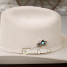 Crafted from shiny silver-tone metal, the Thunderbird hat pin features intricate engraved detailing that highlights the iconic thunderbird shape. At the center, a diamond-shaped turquoise-colored stone serves as a captivating focal point.