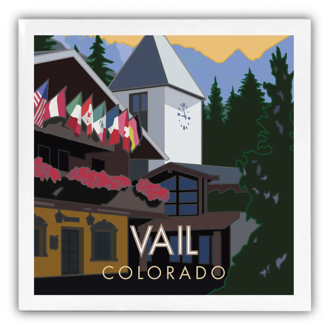 When the snowy, Rocky Mountain views melt, travelers return to the beauty of the Vail village for flowers, food, and fun! Our original Vail Village Summer design features the infamous clocktower and reminds visitors of their high-mountain summer days in the Vail Valley. We hand-press our designs onto glazed ceramic tiles, in our Colorado art studio, in small batches just for you. Measuring 4.25" x 4.25", our coasters arrive with a protective cork affixed to the back, ready for use.
